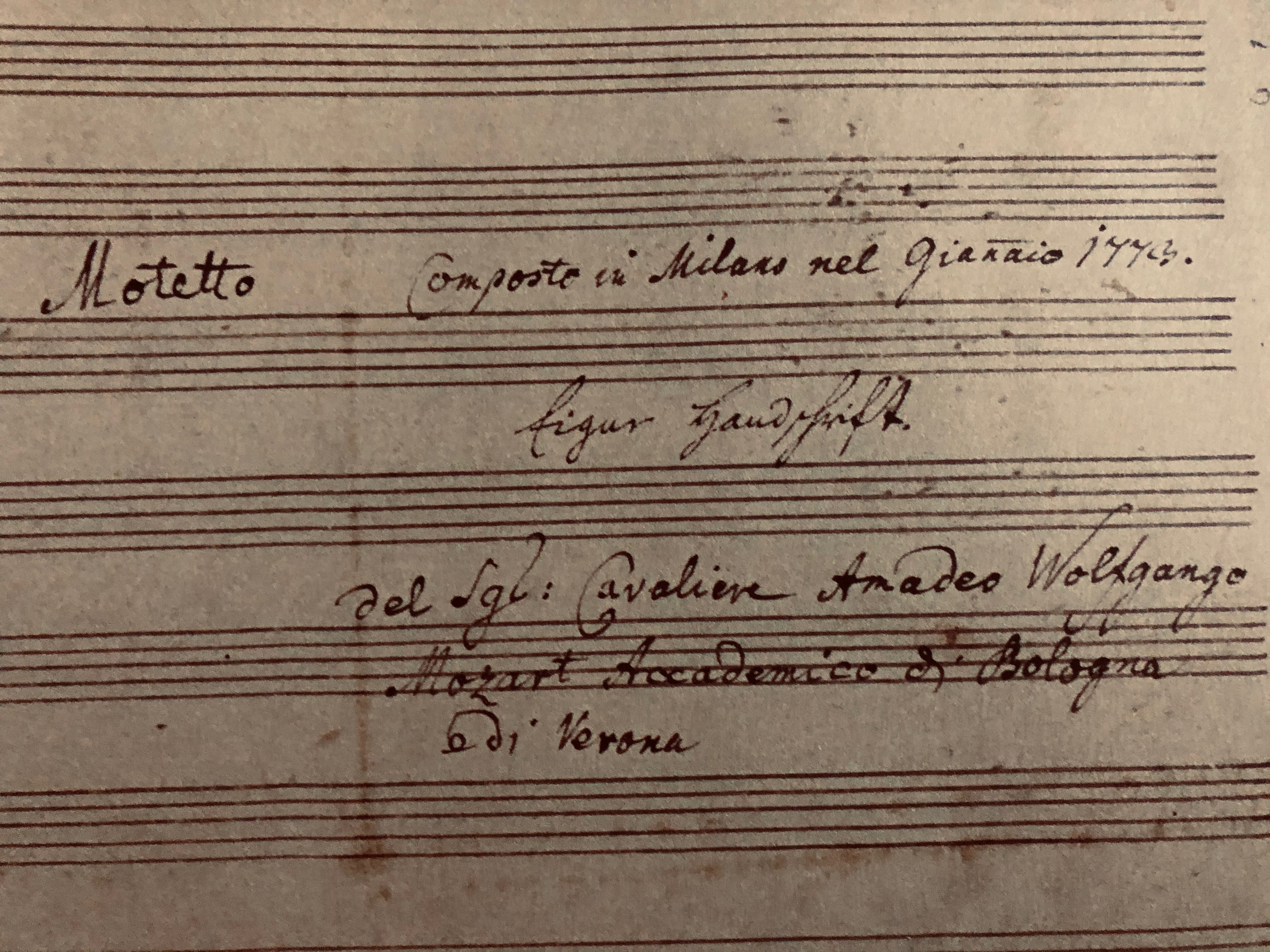 Motetto [spostato a destra] Composto in Milano nel Gian[n]aio 1773. / figur Gaudfrift. / del Sg’: Cavaliere Amadeo Wolfgango / Mozart Accademico di Bologna / e di Verona.